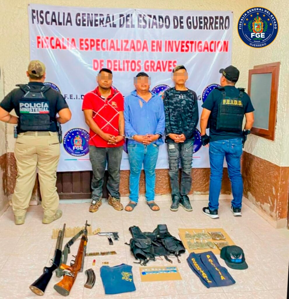 Chilpancingo, Gro. a 18 de agosto de 2024.- En acciones operativas interinstitucionales realizadas en el municipio de Teloloapan, la Fiscalía General del Estado de Guerrero (FGEGuerrero), detuvo a Rafael alias “El Gorgorio”, Pablo “N” alias “El Quijano” y Pedro “N” alias “La Huichola”, presuntos responsables de narcomenudeo y portación de arma de fuego de uso exclusivo.