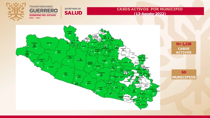 Al informar lo anterior, la Secretaría de Salud indicó que desde el inicio de la pandemia, la entidad acumula 114,339 casos confirmados y 6,812 defunciones, ubicándose en el lugar 23 a nivel nacional en casos activos, que se concentran en 60 municipios, entre ellos Chilpancingo con 341; Acapulco, 218; Iguala, 147; Taxco, 116; Tlapa, 81; Chilapa, 43; Zihuatanejo, 40; Ometepec, 30; Pungarabato, 15; y Huitzuco, 11.