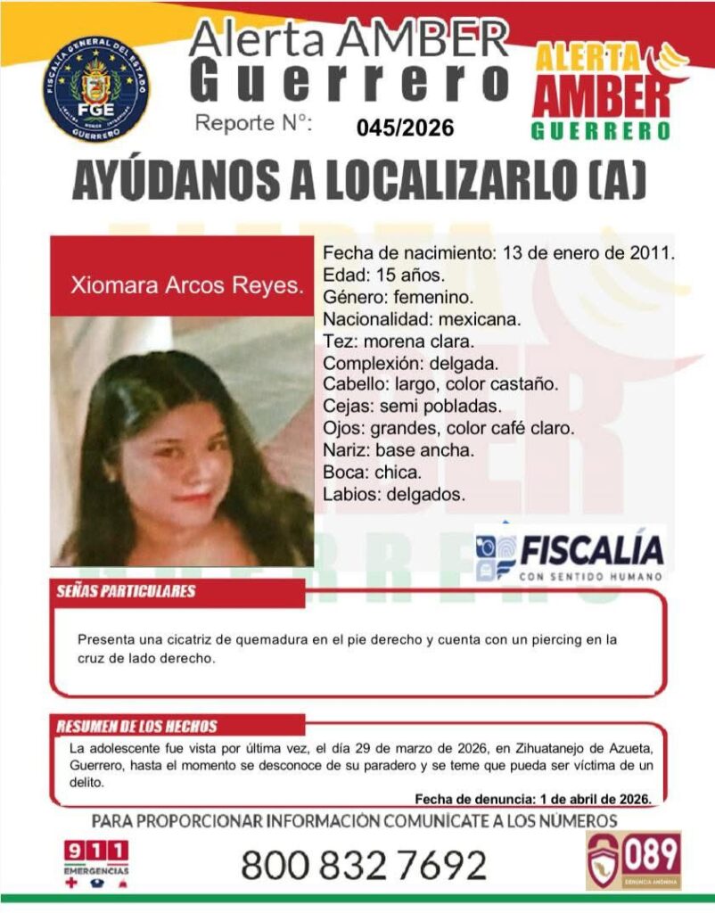 Zihuatanejo de Azueta, Guerrero, 1 de abril de 2026.— Autoridades del estado activaron la Alerta Amber para localizar a la adolescente Xiomara Arcos Reyes, de 15 años de edad, quien fue reportada como desaparecida en este municipio.