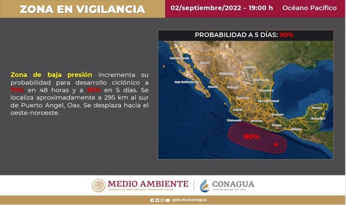 Dicho sistema la tarde de este viernes se localizaba al sur de las costas de Oaxaca, misma que se espera el próximo sábado o domingo, se desplace cercano a las costas de Guerrero como un posible ciclón tropical, incrementando el potencial de lluvias en las regiones Costa Chica, Montaña, Acapulco, Centro, Costa Grande y la parte alta de la Sierra, principalmente.