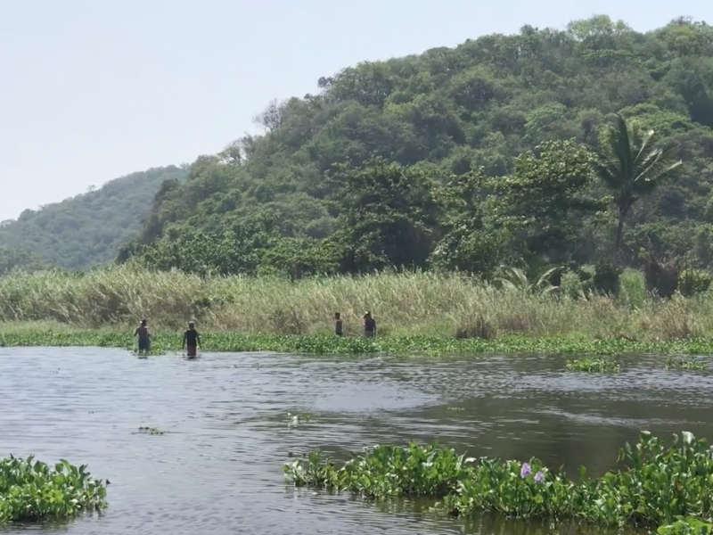 Vecinos de la comunidad de Pantla, alertaron sobre la presencia de un lagarto en la poza que se hace en el vado del río.