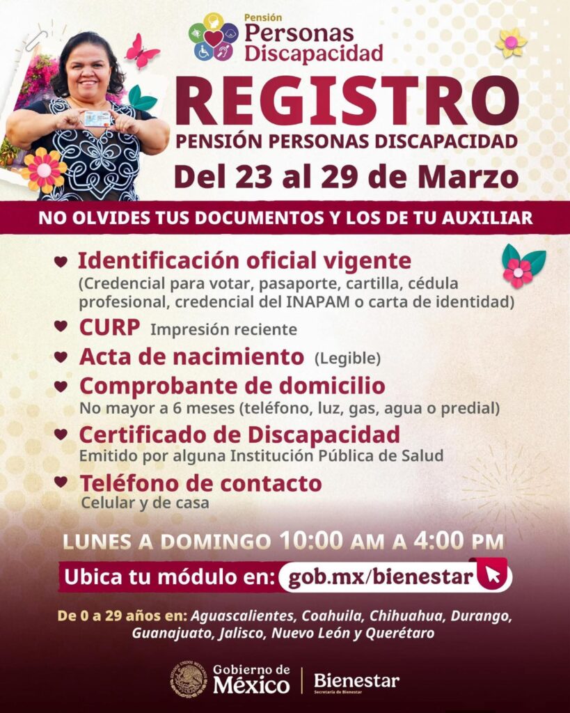 Detalló que, esta pensión está dirigida a personas con discapacidad permanente de 0 a 64 años; con nuevo registro del 23 al 29 de marzo de acuerdo al calendario con la primera letra del primer apellido que se puede consultar en el siguiente enlace www.gob.mx/bienestar y ubicar su módulo más cercano.
