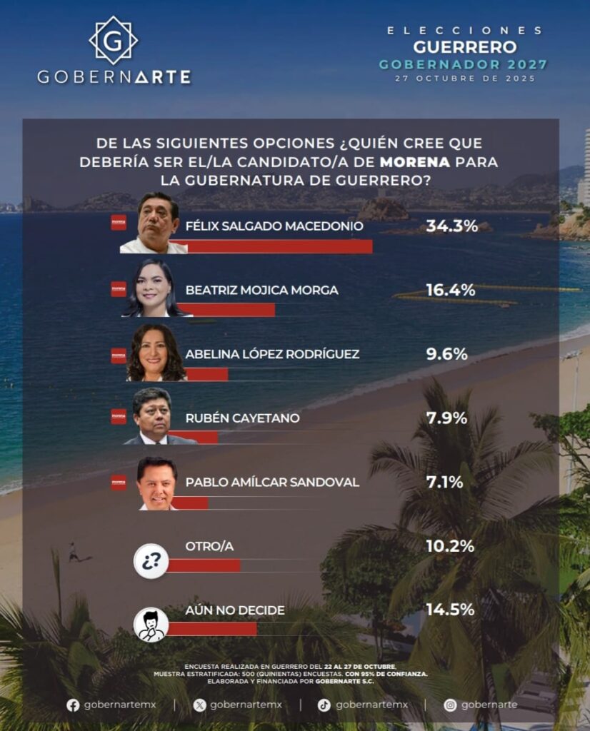 Zihuatanejo, Gro., a 28 de octubre de 2025.- Los resultados de la nueva encuesta de Gobernarte revelan un incremento en la preferencia por el senador Félix Salgado Macedonio para ser el candidato de Morena a la gubernatura de Guerrero, al obtener 34.3 por ciento de las respuestas a la pregunta “¿Quién cree que debería ser el/la candidato/a de Morena para la gubernatura de Guerrero?”.