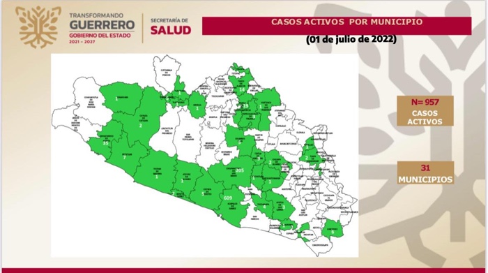 Señaló que al 30 de junio concentra 957 casos en 31 municipios, siendo los principales Acapulco, 609; Chilpancingo, 205; Zihuatanejo, 35; Iguala, 19; Taxco, 14; Tixtla, 9; Benito Juárez, 7; Petatlán, 7; Ometepec, 6; y Coyuca de Benítez, 5.