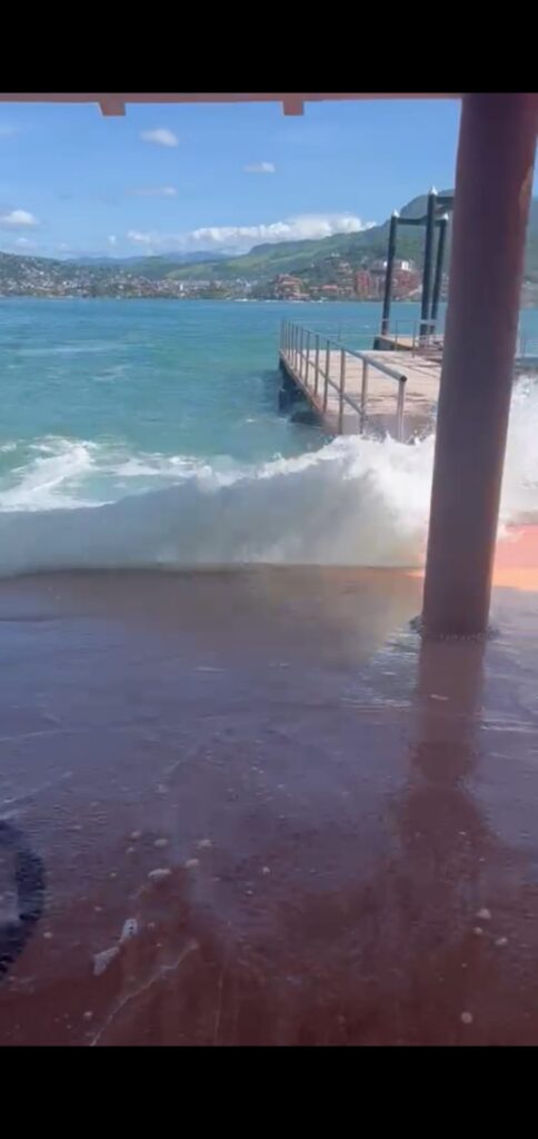 Restauranteros de playa Las Gatas, informaron que el agua del mar, llegó a alcanzar el límite de los primeros cinco restaurantes, incluso el agua se ha subido hasta la plataforma de embarque y desembarque de cemento que colinda con la zona rocosa.