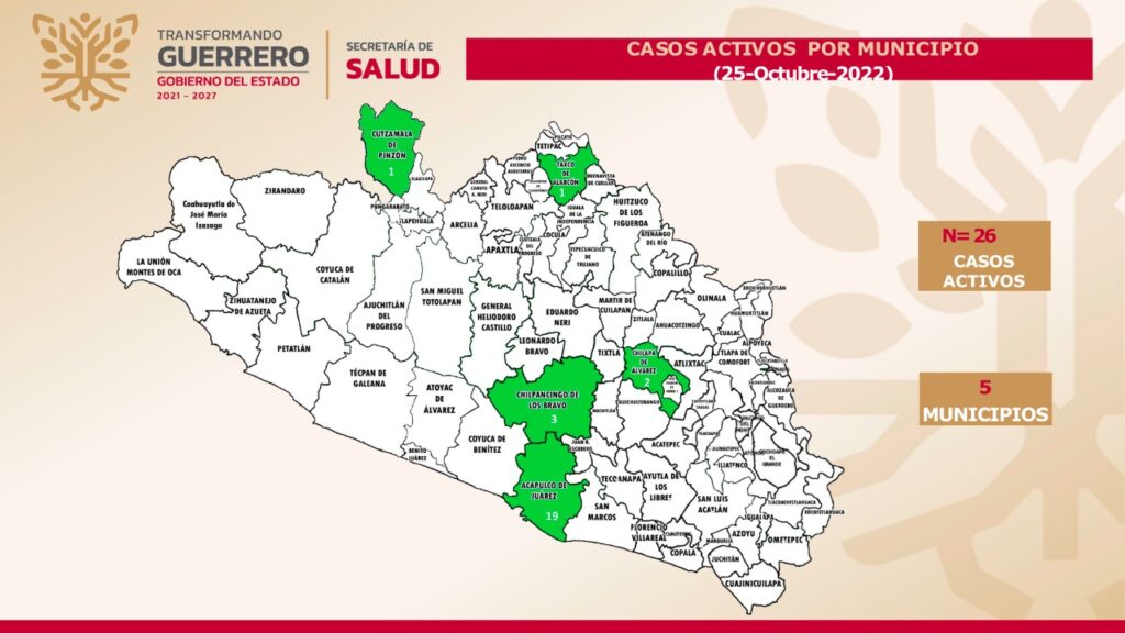 La entidad ocupa el lugar 27 a nivel nacional en casos activos, distribuidos en cinco municipios: Acapulco, 19; Chilpancingo, 3; Chilapa, 2; Cutzamala, 1 y Taxco, 1 caso.