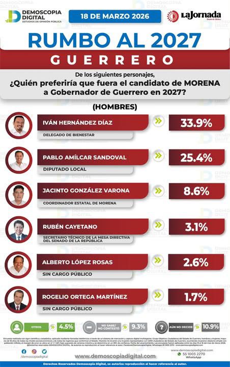 ACAPULCO, Gro., 18 de marzo de 2026.- El delegado federal de Bienestar, Iván Hernández Díaz, se posiciona como el perfil mejor evaluado entre los hombres de Morena rumbo a la gubernatura de Guerrero en 2027, de acuerdo con la más reciente medición de Demoscopía Digital.