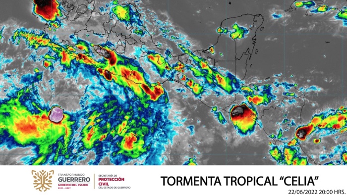 Chilpancingo, Gro., 22 de junio del 2022.- Las extensas bandas nubosas de la tormenta tropical “Celia”, mantendrán el temporal de lluvias puntuales torrenciales durante las próximas horas en gran parte del estado, así como rachas de viento de 60 a 70 kilómetros por hora y oleaje de dos a tres metros de altura en la franja costera, informó la Secretaría de Protección Civil del Gobierno del Estado.