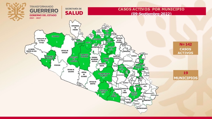 A la fecha se reportan 142 casos activos en todo el estado, los cuales se encuentran principalmente en los municipios de: Chilpancingo 47; Acapulco 40; Taxco 18; Iguala 13; Tlapa 4; Zihuatanejo 4; Chilapa 3; Eduardo Neri, 2; Ajuchitlán 1; y Alpoyeca, 1.
