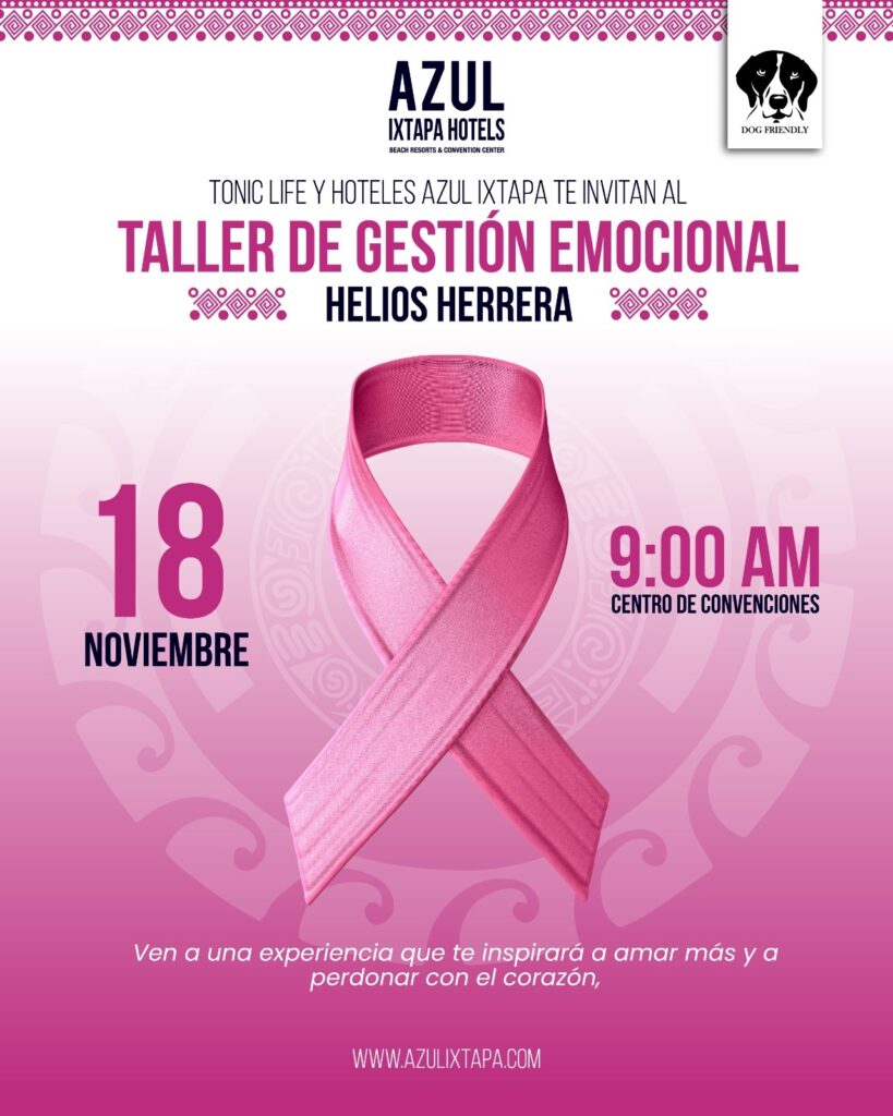 Zihuatanejo, Gro., a 16 de octubre de 2025.- El gerente de Hoteles Azul Ixtapa, Luis Castañeda Muñoz, lanzó una invitación abierta al público, principalmente dirigida a mujeres que han superado o enfrentan el cáncer de mama, así como a personas que atraviesan por cualquier tipo de cáncer, para asistir al Taller de Gestión Emocional que encabezará el especialista Helios Herrera.