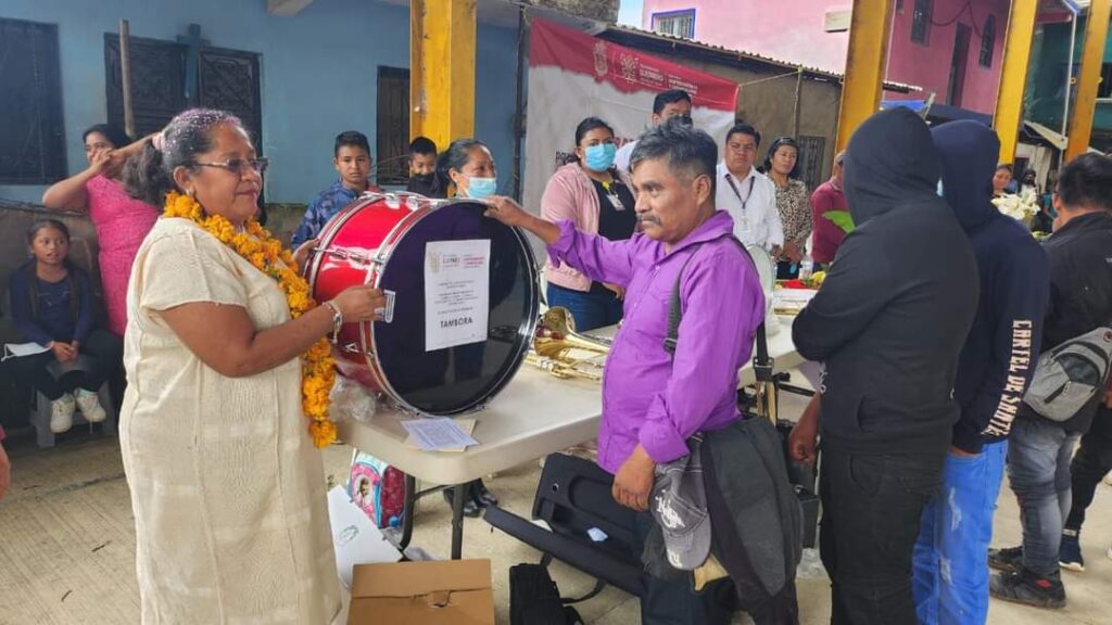 Por último, y como parte del programa “Transformando el Desarrollo de las Culturas e Identidades de los Pueblos Indígenas”, la titular de la SAIA entregó instrumentos musicales a la banda de música de viento de la comunidad, dando cumplimiento a la petición realizada ante la SAIA por sus integrantes.