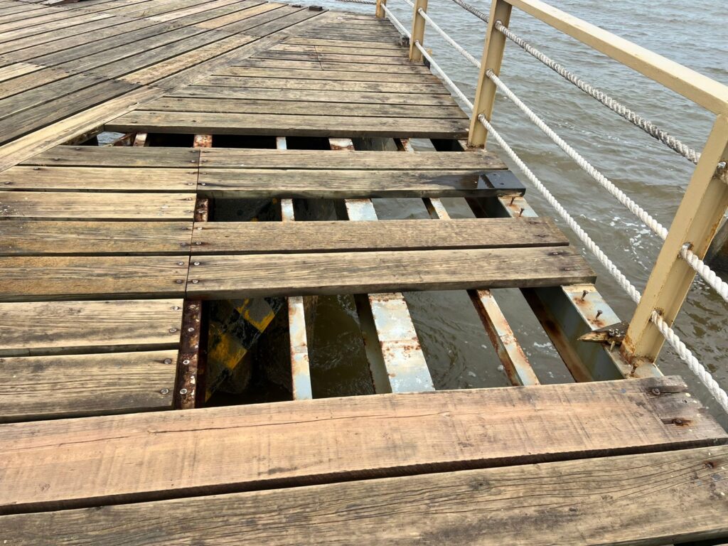 Durante la noche del sábado, el fuerte oleaje provocó el desprendimiento de varias tablas del muelle de playa Linda en la zona hotelera II de Ixtapa.