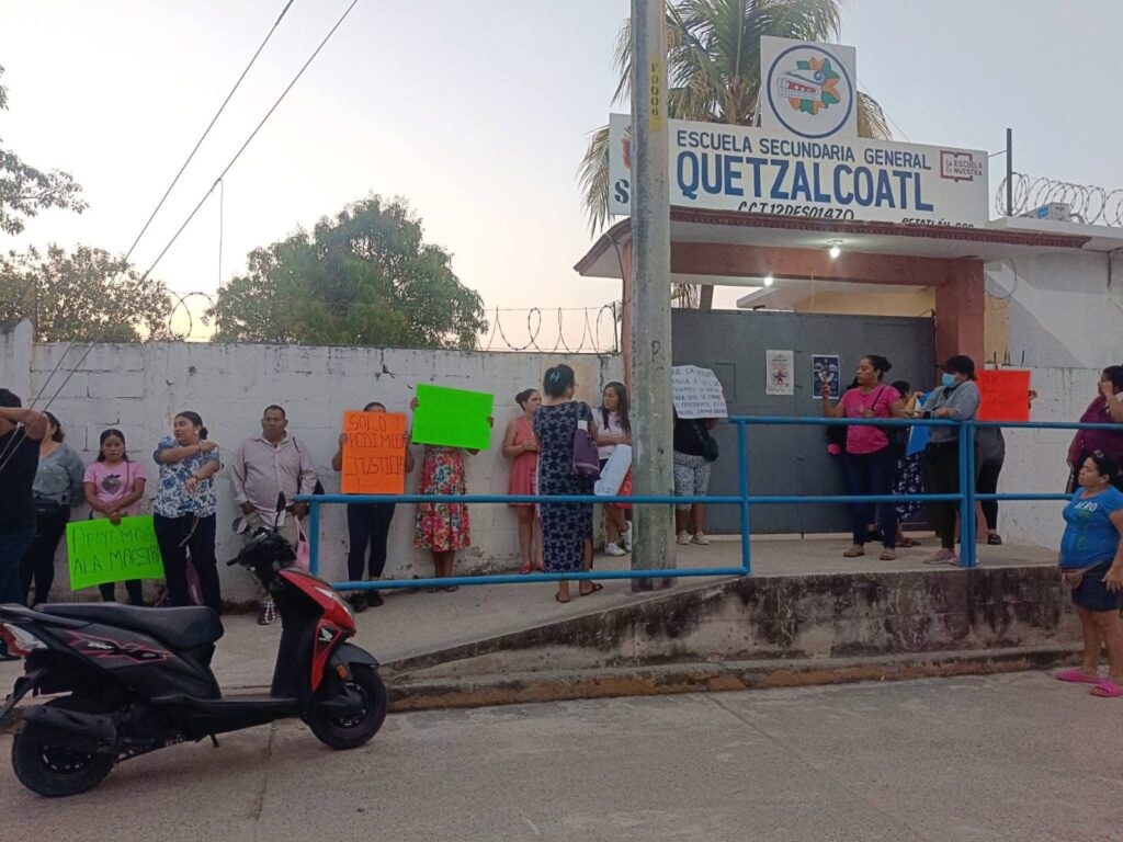 (Petatlán, Gro, a 24 de febrero de 2026).-Estos martes padres de familia tomaron el plantel de la secundaria Quetzalcóatl, ubicada en Petatlán para exigir la permanencia de la docente de la materia de Matemáticas, Jazmín Galeana Vargas quien señala fue puesta a disposición con señalamientos infundados e irregularidades en el proceso.