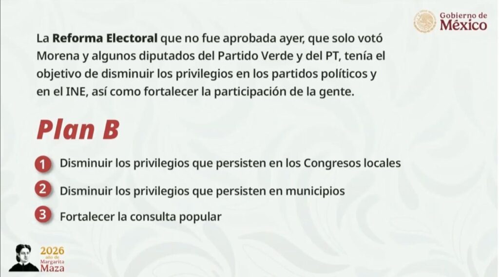 PRESIDENTA CLAUDIA SHEINBAUM ENVIARÁ EL LUNES PLAN B DE LA REFORMA ELECTORAL PARA DISMINUIR PRIVILEGIOS EN CONGRESOS LOCALES, EN MUNICIPIOS Y FORTALECER LA CONSULTA POPULAR