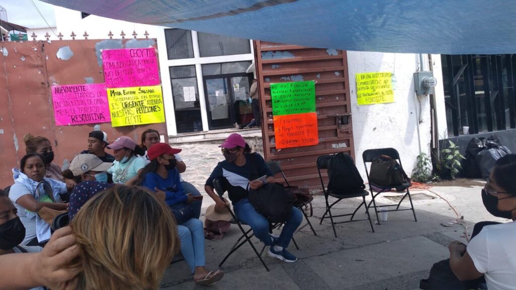 Una comisión de trabajadores sindicalizados del Cecyteg -EMsaD de Petatlán, se unieron al plantón estatal que mantienen 10 escuelas en Guerrero para exigir al gobierno del estado que cumplan con el pago retroactivo de incremento salarial y actualización de pagos al FOVISSSTE, entro otros seis puntos.