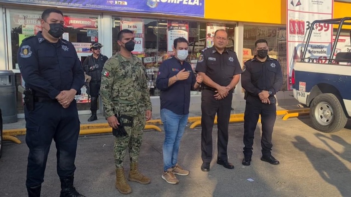 Esta mañana, el subsecretario de Prevención y Operación Policial de la Secretaría de Seguridad Pública Estatal junto al presidente municipal, Jorge Sánchez Allec y el director de la Policía Preventiva y Tránsito Municipal, Carlos Sedas Taracera realizaron recorridos de supervisión en diversas sucursales.