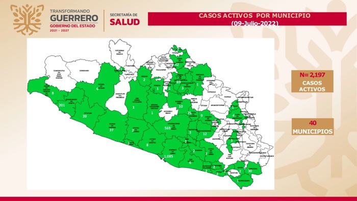 Chilpancingo, Gro., 09 de julio 2022.- La Secretaría de Salud Guerrero (SSG) informó que la ocupación de camas COVID-19 es de 22% con 2,197 casos activos, de los cuales 379 se confirmaron en las últimas 24 horas.