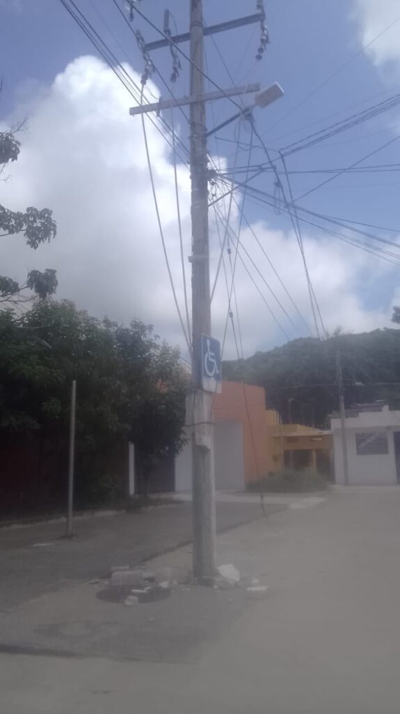 (Ruth Sánchez/ Zihuatanejo, Gro, a 15 de octubre de 2025).-Vecinos de la calle Mar Negro, denunciaron las malas condiciones en las que se encuentra un poste de energía eléctrica ubicado frente al Auditorio Municipal.