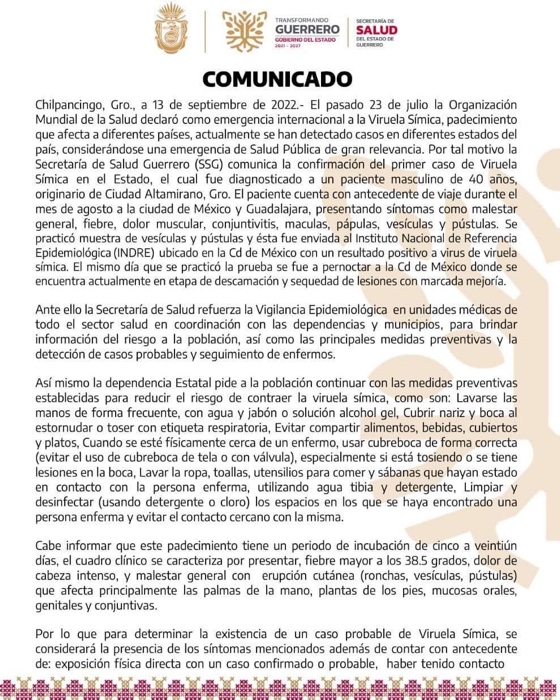 La Secretaría de Salud confirmó el primer caso de viruela símica en Guerrero, que le fue diagnosticada a un paciente masculino de 40 años de edad, originario de Ciudad Altamirano.