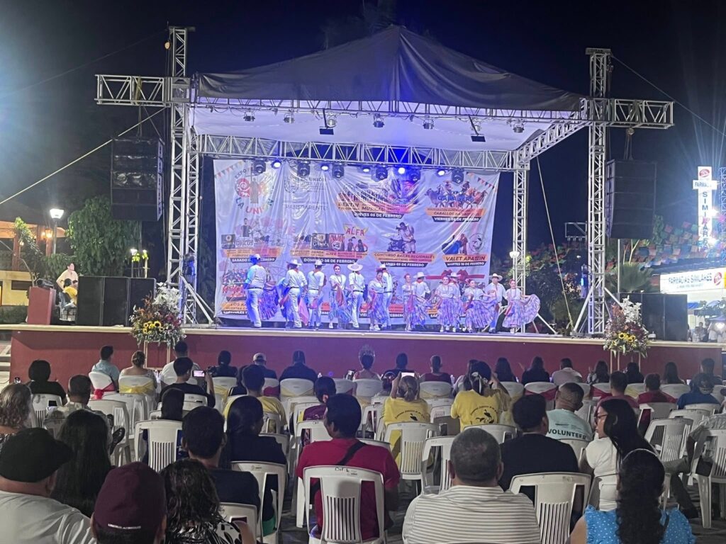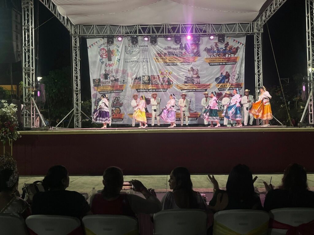 Zihuatanejo, Gro., a 11 de febrero de 2026.- Integrantes del Ballet Folclórico Apatzin se presentaron la noche del martes en la explanada del municipio de La Unión, como parte de la Expoferia San Felipe de Jesús 2026.