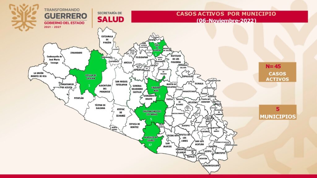 Al presentar el informe técnico diario sobre el estado de la pandemia en Guerrero, indicó que la entidad acumula 116,047 casos confirmados y 6,847 defunciones, y ocupa el lugar 22 nacional en casos activos, distribuidos en cinco municipios: Acapulco, 37; Chilpancingo, 5; Coyuca de Catalán, 1; Eduardo Neri, 1; y Taxco de Alarcón, 1.