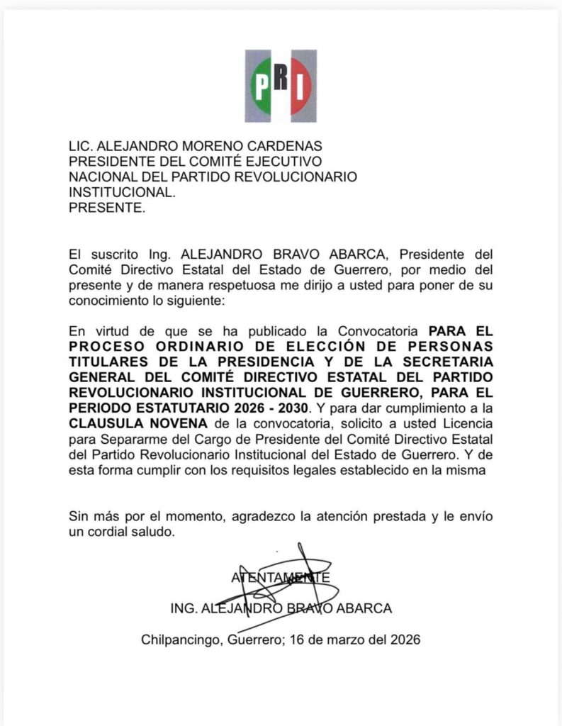 El documento dirigido al presidente nacional de ese partido, Alejandro Moreno Cárdenas, la noche del lunes, fue compartido por el mismo Bravo Abarca, quien explicó que fue con la finalidad de cumplir los requisitos y participar en el proceso ordinario de elección de las personas titulares de la Presidencia y la Secretaría General del comité estatal.