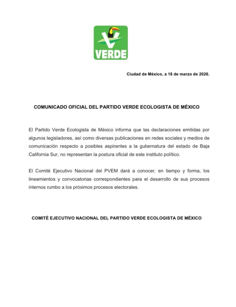 Zihuatanejo, Gro., a 19 de marzo de 2026.- El Partido Verde Ecologista de México (PVEM) puntualizó que será su Comité Ejecutivo Nacional (CEN) el que dé a conocer información de sus procesos internos rumbo a las próximas eleciones.
