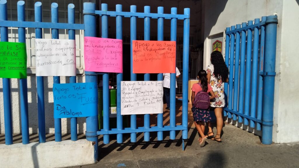Trabajadores sindicalizados de la Secretaría de Salud de los municipios de Zihuatanejo, La Unión, Coahuayutla y Petatlán, expresaron con pancartas en sus respectivos centros de trabajo su apoyo a sus compañeros de la Jurisdicción Sanitaria 05 que están en paro laboral y exigen la destitución de la jefa jurisdiccional, Laura Paloma Chavarría Rodríguez.