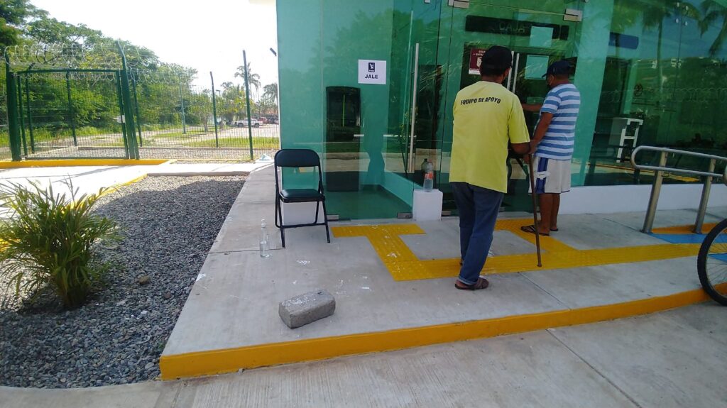 Este medio de comunicación constató que, del banco, únicamente funcionan el cajero automático, donde se puede realizar el retiro de efectivo y movimientos que ya son solicitados principalmente por los adultos mayores que recibieron sus tarjetas recientemente.
