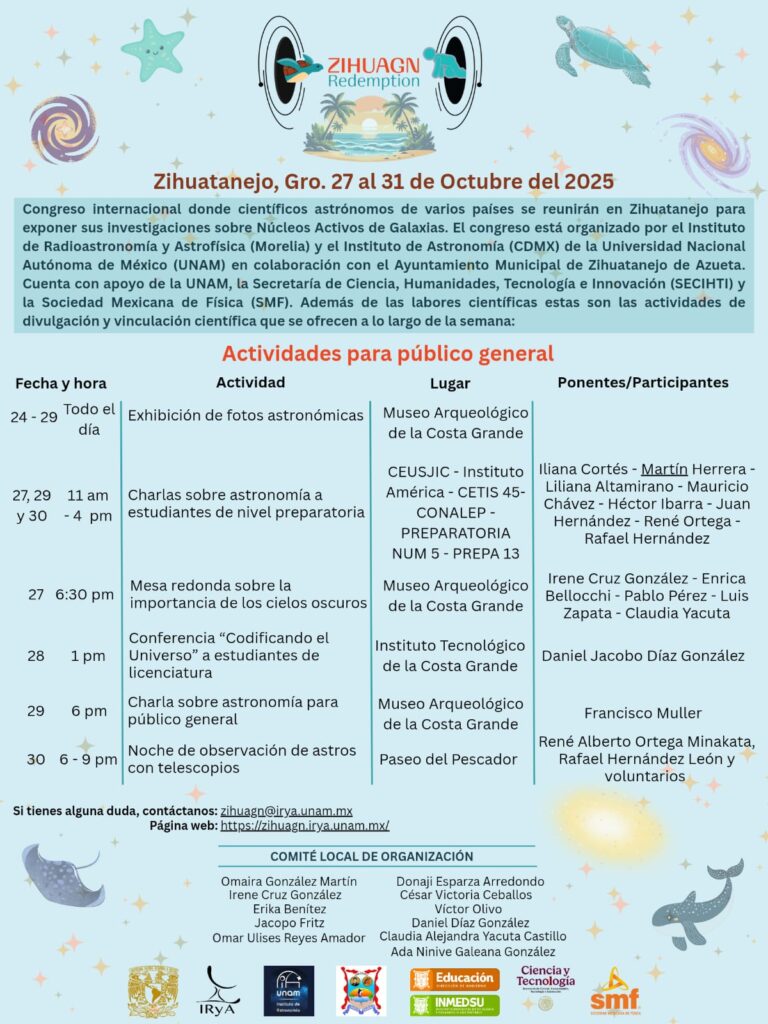 Zihuatanejo, Gro., 27 al 31 de octubre de 2025. — Científicos y astrónomos de distintos países se reunirán en Zihuatanejo para participar en el Congreso Internacional sobre Núcleos Activos de Galaxias, denominado “ZIHUAGN Redemption”, evento que busca compartir los más recientes avances en el estudio del universo y fomentar la divulgación científica entre la población.